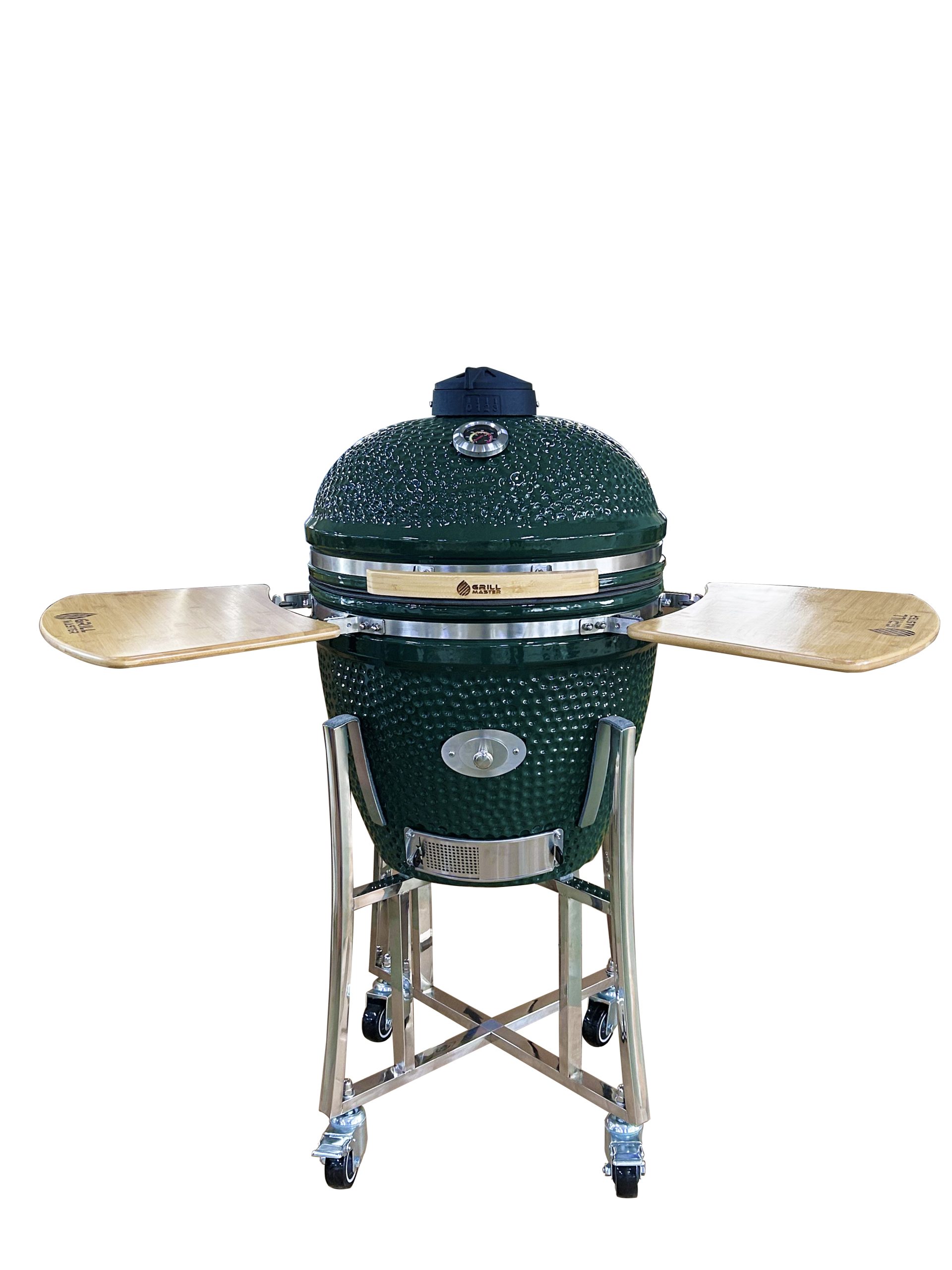 El paquete Pro Max incluye el sistema Divide & Conquer 21″ y una funda protectora. La parrilla cerámica GrillMaster de 21″ presenta forma de huevo, alimentador de virutas de madera, alta eficiencia y bajo consumo de combustible para 6–8 personas. Rango de temperatura: 10–450 °C, ajustable. Ideal para asar, ahumar, rostizar y hornear con resultados jugosos.