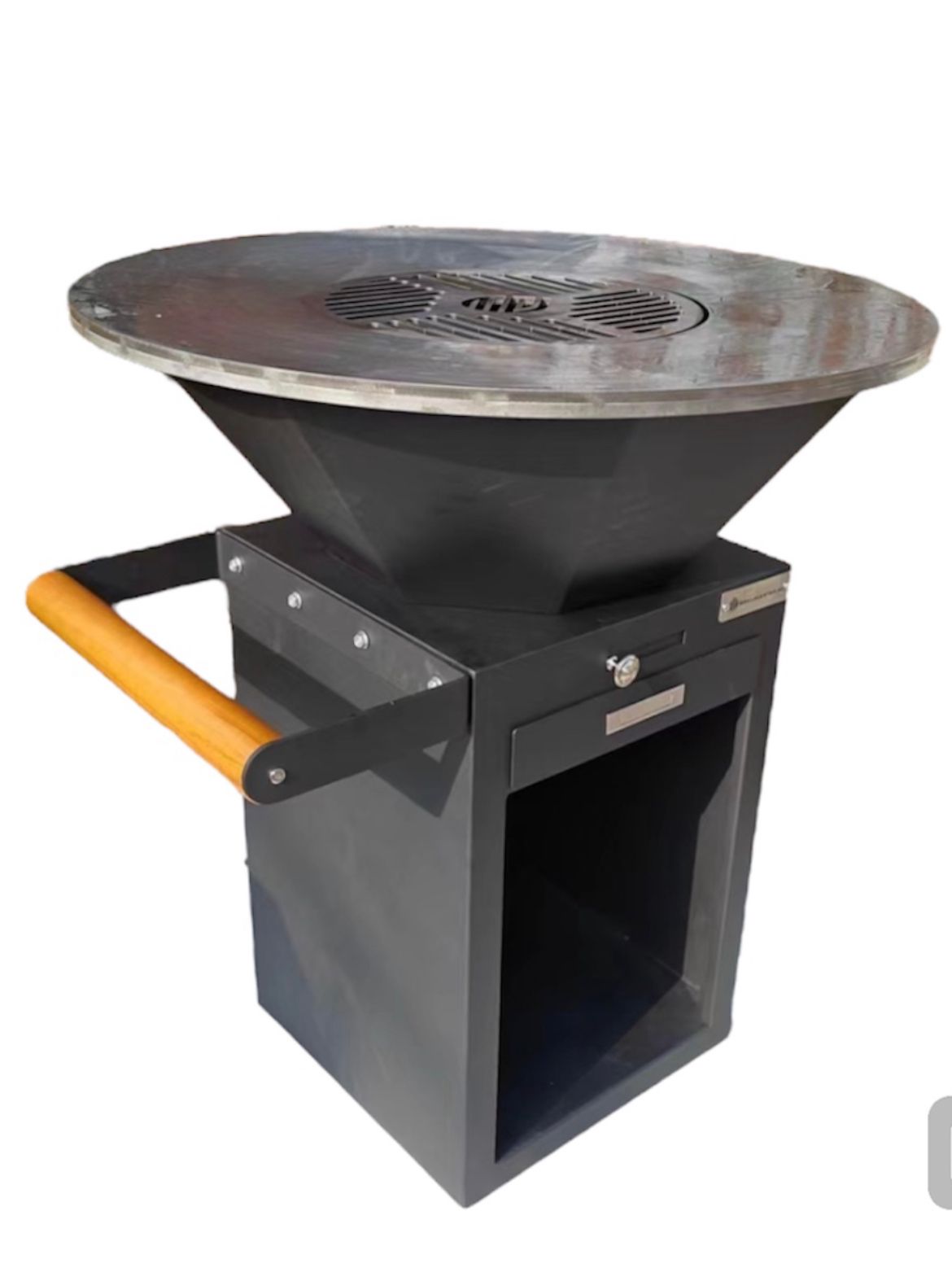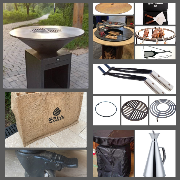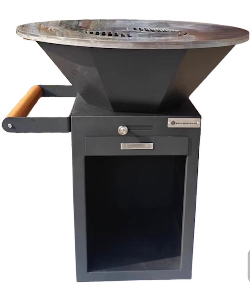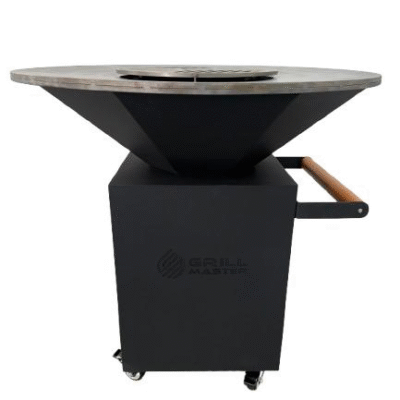 2.602 €GrillMaster Pro Max GM2 100 cm: Placa 10 mm, base 50/50/63, trípode, anillo de madera, tapa extintora, funda protectora y espátula.