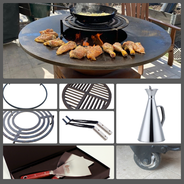 1.858 €GrillMaster Pro GM1 100 cm: Cuenco octagonal, placa 10 mm, asas, trípode, ruedas, dispensador de aceite y set de espátulas.