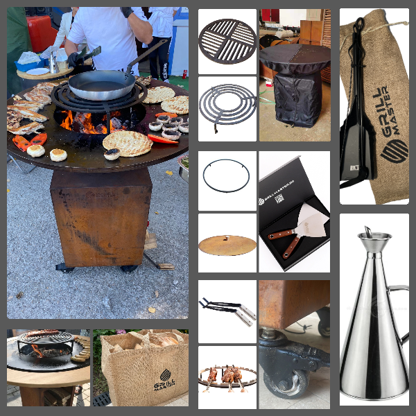 2.893 €GrillMaster Pro Max GM1 100 cm: Cuenco octagonal, placa 10 mm, asas, trípode, dispensador de aceite, espátula, anillo de madera y tapa.